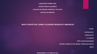 El documento define los bienes muebles e inmuebles según el Código Civil. Los bienes inmuebles son terrenos, minas, edificios y cosas que el propietario ha puesto en el suelo para su uso, como animales de labranza. También incluyen derechos sobre predios sujetos a enfiteusis y servidumbres prediales. Los bienes muebles son cosas que pueden cambiar de lugar por sí mismas o movidas por una fuerza, e incluyen derechos incorporales como derechos reales e intangibles