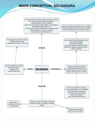 La soldadura es un proceso de unión de materiales mediante la aplicación de calor o presión. Incluye diferentes tipos como soldadura por arco, soldadura por resistencia, soldadura por gas y soldadura por ultrasonido. Cada tipo tiene sus propias características y usos comunes.