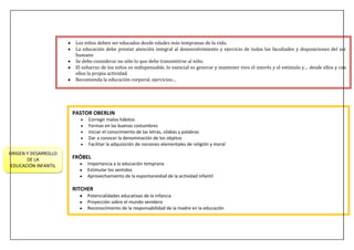 Los principales pensadores en la educación infantil destacan que los niños deben ser educados desde edades tempranas a través de un enfoque integral que desarrolle todas sus facultades. La educación infantil debe prestar atención al desarrollo físico, intelectual y moral del niño mediante el juego, la experiencia y generando interés, sin enfoques rígidos o imposición de conocimientos. Actualmente se entiende como la primera etapa educativa para formar de manera holística al niño en cooperación con su familia.