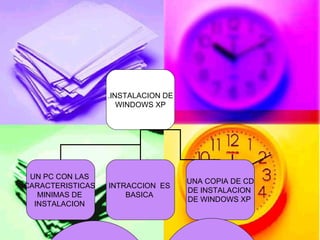 El documento describe los pasos para instalar Windows XP en una PC, incluyendo conectar el CD de instalación, configurar la BIOS, conectar el cable de poder a la fuente de poder y a la motherboard, conectar los discos duros, tarjetas de sonido y video, memoria RAM e impresora mediante cables.