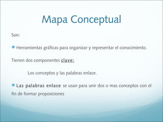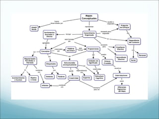 Este documento describe los mapas conceptuales y mentales. Los mapas conceptuales son herramientas gráficas que organizan el conocimiento mediante conceptos y palabras de enlace. Los mapas mentales son una forma creativa de conjugar ideas mediante palabras clave, asociaciones, organización y memoria visual. Ambos son útiles para recordar información y resolver problemas de manera creativa.