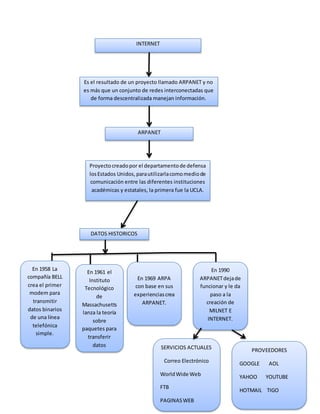 Internet es el resultado del proyecto ARPANET y consiste en una red descentralizada de redes interconectadas que comparten información de manera cooperativa. ARPANET fue creado por el Departamento de Defensa de EE.UU. para facilitar la comunicación entre instituciones académicas y estatales, conectando inicialmente a la UCLA. El desarrollo de Internet se basó en avances tecnológicos como el modem y la teoría de paquetes de datos en las décadas de 1950 y 1960, llevando a la creación de ARPANET en 1969 y