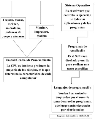El documento describe la arquitectura de un computador, dividiéndola en hardware y software. El hardware incluye los circuitos, elementos y equipos electrónicos como dispositivos de entrada, salida y la unidad central de procesamiento. El software se refiere a los programas y tiene tipos como el sistema operativo, programas de ampliación y lenguajes de programación.