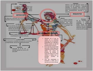El documento analiza la figura de la admisión de hechos según el artículo 371 del Código Orgánico Procesal Penal (COPP), destacando su relevancia procesal y constitucional en los casos donde el acusado acepta los hechos y puede resultar en una sentencia condenatoria. También se aborda el procedimiento especial para el enjuiciamiento de altos funcionarios del estado, incluido el presidente de la república, y las condiciones bajo las cuales el Tribunal Supremo de Justicia debe actuar. Además, se discute la renuncia voluntaria de derechos por parte del imputado y los requisitos que deben cumplirse para iniciar dicho proceso.