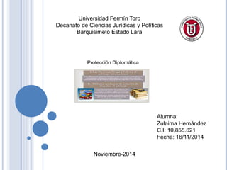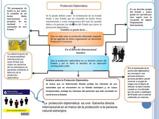 El documento trata sobre la protección diplomática, que se define como la reclamación de un estado frente a otro por un hecho ilícito internacional que afecta a sus ciudadanos. Este derecho, propio del estado, asegura que los intereses de los nacionales en el extranjero sean defendidos, permitiendo que obtengan asistencia de su país cuando sus derechos son vulnerados. La protección diplomática se ejerce bajo ciertos principios y condiciones, como la necesidad de que el nacional tenga la ciudadanía del estado que reclama.