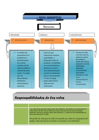 El documento presenta un mapa conceptual sobre los recursos mentales necesarios para resolver problemas de forma progresiva, como la exploración, la sabiduría y el entendimiento. A medida que se avanza en un proyecto, surgen nuevos desafíos que se deben ir resolviendo paso a paso, lo que permite desarrollar habilidades y conocimientos que serán útiles para los próximos retos. También destaca la importancia de definir claramente los roles y responsabilidades de cada miembro de un equipo.