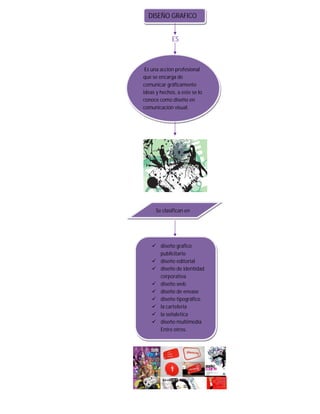 El diseño gráfico es una acción profesional que se encarga de comunicar ideas y hechos gráficamente. Se clasifica en diseño gráfico publicitario, editorial, de identidad corporativa, web, envases, tipográfico, cartelería, señalética y multimedia. Tiene sus orígenes en la pintura rupestre y el lenguaje escrito, aunque evolucionó a partir del siglo XIX con la imprenta y las vanguardias artísticas. Actualmente, los diseñadores gráficos utilizan herramientas digitales y se