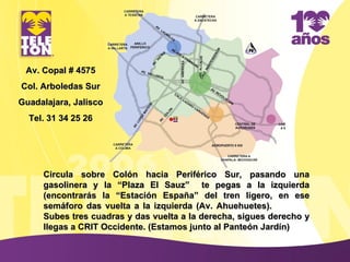 El documento proporciona instrucciones para llegar al CRIT ubicado en Av. Copal # 4575 Col. Arboledas Sur Guadalajara, Jalisco. Indica circular sobre Colón hacia Periférico Sur, pasando una gasolinera y la Plaza El Sauz, pegarse a la izquierda en el semáforo de la Estación España del tren ligero y dar vuelta a la izquierda en Av. Ahuehuetes, subir tres cuadras y dar vuelta a la derecha para llegar al CRIT Occidente, localizado junto al Panteón J