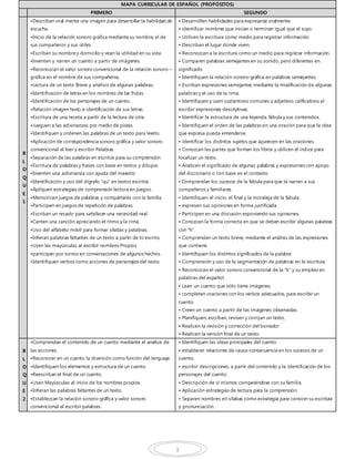 Este documento presenta un mapa curricular de español para primero y segundo grado con los propósitos de cada bloque. Incluye objetivos relacionados con el desarrollo de habilidades de lectura, escritura, comprensión lectora y expresión oral a través de actividades como describir imágenes, escribir nombres, inventar cuentos, identificar letras y palabras, y aplicar correspondencia grafema-fonema. Los bloques también incluyen objetivos para trabajar con géneros textuales como cuentos, poesía, trabajen