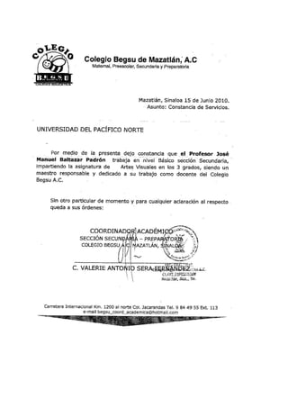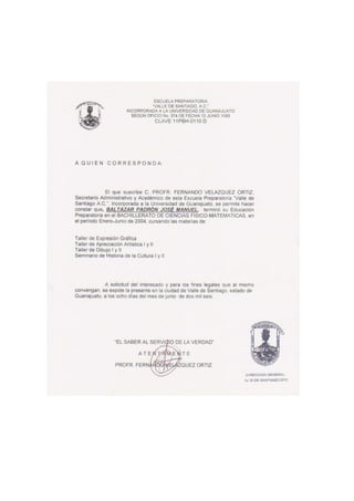 Este documento es una constancia de estudios de nivel básico en la Escuela Popular de Bellas Artes de Morelia, Michoacán. Certifica que la persona mencionada completó sus estudios de nivel medio superior en dicha institución.