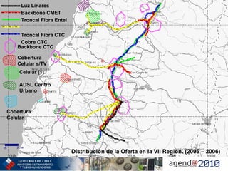 El documento presenta un resumen del mapa de conectividad de la VII Región en Chile. Describe la distribución actual de la oferta de conectividad e identifica focos poblacionales priorizados. También realiza un catastro de las necesidades de la región en temas de conectividad e identifica proyectos específicos para mejorar la conectividad en áreas rurales. Finalmente, analiza la cobertura actual de la empresa Telmex en la región.