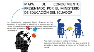 Este documento presenta el plan de estudios de un curso de Ciencia y Tecnología. El plan propone organizar el curso en dos partes, una secuencial que cubre conceptos científicos de manera motivadora, y una paralela donde los estudiantes realizan proyectos de investigación individuales. El objetivo es despertar la curiosidad de los estudiantes por los descubrimientos científicos a través de actividades vivenciales que promuevan la iniciativa y la creatividad.