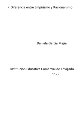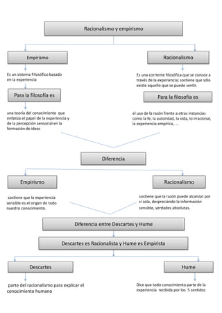 El documento contrasta el racionalismo y el empirismo como corrientes filosóficas. El racionalismo sostiene que la razón puede alcanzar verdades absolutas sin depender de la experiencia sensible, mientras que el empirismo afirma que toda nuestro conocimiento proviene de la experiencia sensorial. Como ejemplos, se menciona que Descartes representa el racionalismo al creer que el conocimiento parte de la razón, mientras que Hume es empirista al sostener que el conocimiento se origina en la experiencia de los sentidos.