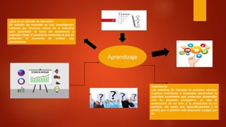 Este documento define un estudio de mercado como una investigación utilizada por diversas industrias para tomar mejores decisiones y comprender mejor el panorama comercial. Explica que los estudios de mercado proporcionan información útil sobre los gustos, necesidades y preferencias de los consumidores. También analiza conceptos clave como oferta, demanda y tipos de productos.