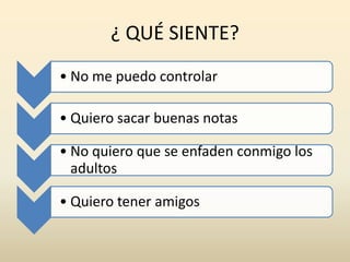 Este documento presenta un mapa de empatía de un niño que tiene dificultades para controlarse, quedarse quieto y respetar las normas. El niño quiere sacar buenas notas y tener amigos, pero a menudo es insultado por otros niños e incluso regañado por los profesores. El niño se esfuerza por controlarse, ser más ordenado y seguir las pautas que le proponen para tener más amigos y que la gente que le rodea esté más contenta con él.