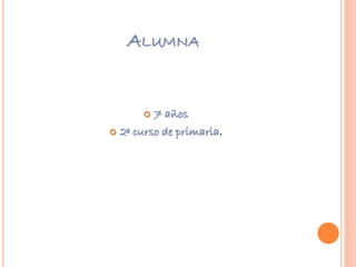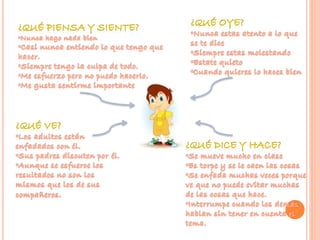 La alumna de 7 años tiene dificultades para mantener la atención y completar tareas, lo que causa que maestros y padres estén siempre enfadados con ella. Intenta esforzarse pero a menudo no puede hacer las tareas tan bien como sus compañeros. Le gusta llamar la atención de los demás pero esto a veces causa conflictos.