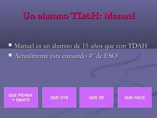Manuel es un estudiante de 15 años con TDAH que está cursando 4o de ESO. Siente que no puede sacar buenas notas a pesar de esforzarse y que sus padres y profesores piensan que es vago. Escucha constantemente regaños de sus profesores y compañeros lo evitan. Se siente nervioso cuando sus profesores le ponen partes y sus padres no esperan mucho de él.