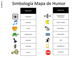 Este documento presenta la técnica del Mapa de Humor y el gráfico emocional como herramientas para representar las emociones de los estudiantes durante una actividad. Explica la simbología utilizada en el Mapa de Humor y cómo el Gráfico Emocional muestra las emociones de los estudiantes en diferentes momentos de una actividad. Finalmente, presenta el Mapa de la estructura local del Afecto-Cognición para representar las actitudes de los estudiantes a lo largo del proceso de una tarea.