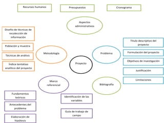 El documento presenta un diagrama con los componentes clave para el diseño de un proyecto de investigación. Estos incluyen la identificación del problema y objetivos de investigación, marco teórico, metodología, diseño de técnicas de recolección de datos, análisis de datos, y aspectos administrativos como cronograma y presupuesto. El diagrama provee una guía general para el desarrollo de un proyecto de investigación completo.