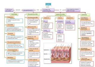 El documento es un trabajo académico de la Universidad Técnica de Ambato que describe la anatomía de la piel, su estructura y funciones. La piel, que representa el 30% del peso de un adulto y es el órgano más extenso del cuerpo humano, cumple funciones de protección, inmunidad, regulación de temperatura y percepción de estímulos. Se detalla la composición celular de la piel, incluyendo queratinocitos, melanocitos y células de Merkel, así como las capas que la conforman: epidermis, dermis y hipodermis.