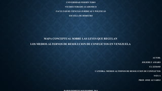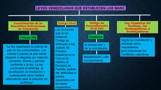 El documento resume las principales leyes venezolanas que regulan los medios alternos de resolución de conflictos. Estas incluyen la Constitución, el Código Civil, la Ley Orgánica del Trabajo, el Código Procesal Penal, la Ley del Arbitraje Comercial y la Ley Orgánica de la Justicia de Paz, las cuales establecen mecanismos como la conciliación, mediación, arbitraje y justicia de paz para resolver disputas de manera alternativa a los tribunales.