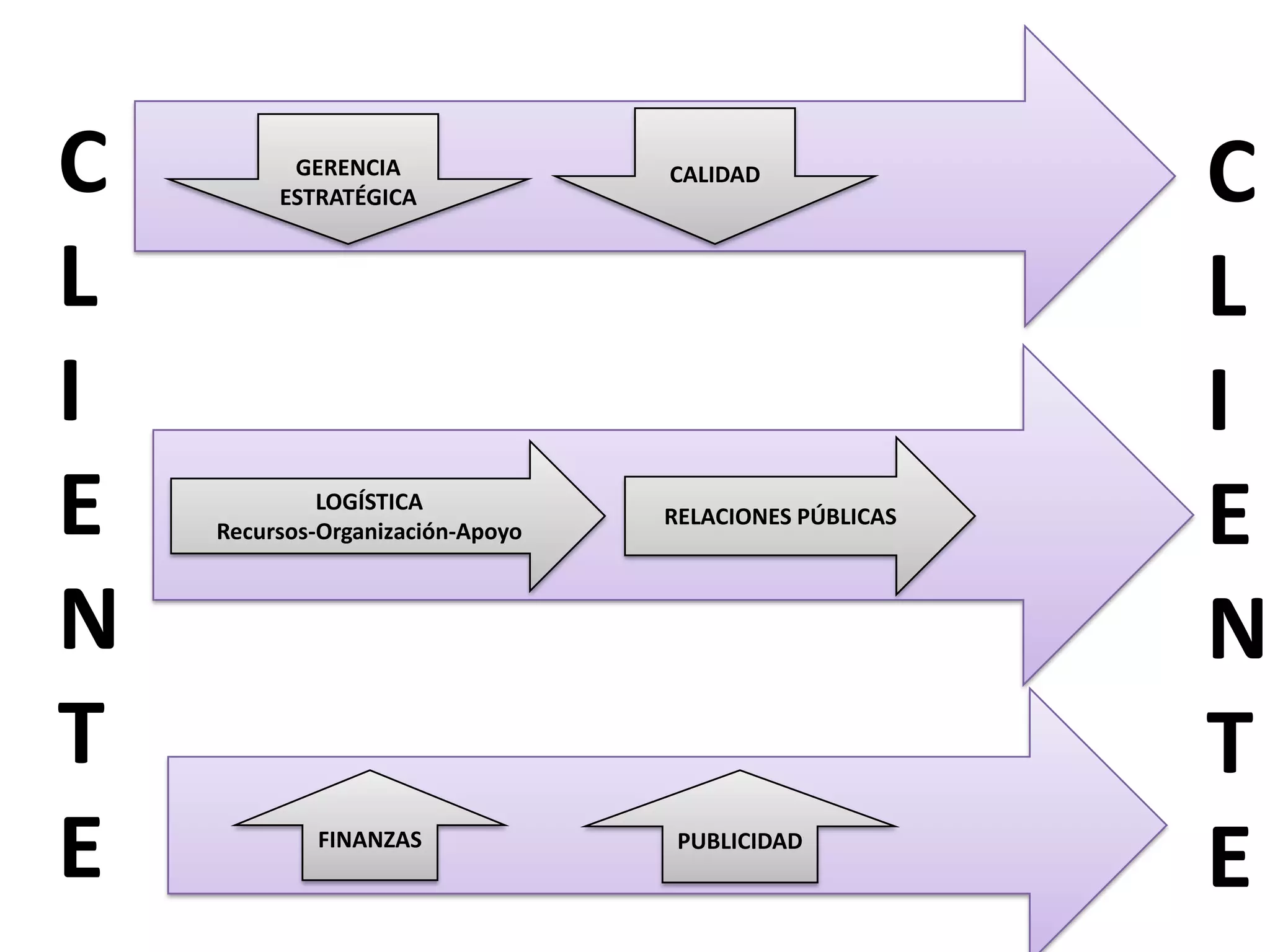 La organización describe las principales áreas funcionales de una empresa como gerencia estratégica, calidad, logística, finanzas, relaciones públicas y publicidad.