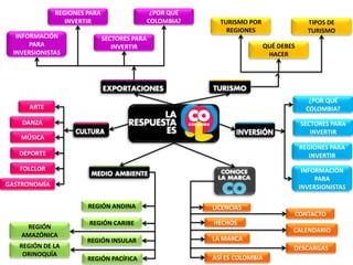 Este documento presenta información sobre las diferentes regiones de Colombia para inversionistas, incluyendo las regiones Andina, Caribe, Amazónica, de la Orinoquía y Pacífica. También discute sectores clave para invertir como arte, danza, música, deporte, folclor y gastronomía, así como tipos de turismo por región.