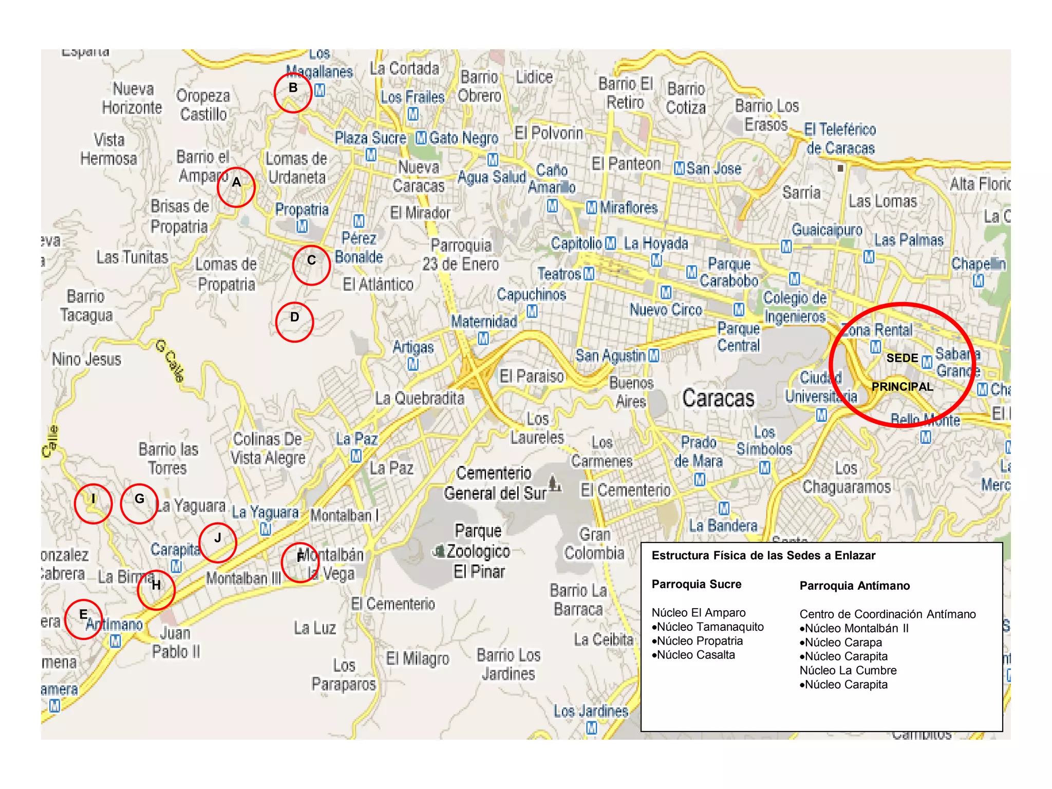 El documento lista las diferentes sedes y núcleos que componen dos parroquias, Sucre y Antímano, en Caracas, Venezuela. La Parroquia Sucre incluye los núcleos de El Amparo, Tamanaquito, Propatria y Casalta. La Parroquia Antímano contiene el Centro de Coordinación Antímano y los núcleos de Montalbán II, Carapa, Carapita y La Cumbre.