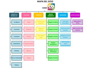 El mapa del sitio presenta las diferentes secciones del sitio web divididas en categorías como Cultura, Turismo, Medio Ambiente, Inversión y Exportaciones. Dentro de cada categoría hay subsecciones adicionales que brindan información sobre las diferentes regiones de Colombia, sus atracciones turísticas, oportunidades de inversión, cultura y más.