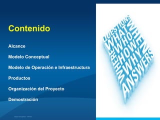 Este documento describe el Mapa Energético-Minero, un sistema de información geoespacial que permite el acceso y análisis de datos georreferenciados relacionados con la energía y la minería en Perú. El mapa utiliza una base de datos centralizada y arquitectura técnica para proporcionar información a partir de múltiples dispositivos. El objetivo es apoyar la regulación, supervisión y toma de decisiones en diferentes niveles de gobierno y empresas sobre temas de electricidad, gas natural, hidrocarburos y min