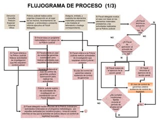 ¿El Fiscal daaplicación al principio de oportunidad (CG -RR) ? 1 Denuncio Querella Petición Especial Informe Oficio Policía Judicial realiza actos urgentes (inspección en el lugar de los hechos, levantamiento de cadáver, y entrevistas) y presenta informe ejecutivo al Fiscal delegado. Asegura, embala, y custodia los elementos materiales probatorios y los traslada al laboratorio o bodega correspondiente. El Fiscal delegado evalúa el caso con base en los elementos materiales probatorios y las actividades realizadas por la Policía Judicial El Fiscal traza un programa metodológico con apoyo de la Policía Judicial El Fiscal ordena a la Policía Judicial realizar actividades de investigación que requieren control judicial posterior El Fiscal solicita al Juez de control de garantías autorización para realizar actividades que requieren control previo Policía Judicial realiza las actividades de investigación en coordinación con el Fiscal delegado El juez de control de garantías celebra audiencia de control de garantías El Fiscal ordena a la Policía Judicial realizar actividades de investigación que NO requieren control judicial El Fiscal delegado recibe informes de la Policía Judicial por actividades ordenadas en el programa metodológico, por aquellas realizadas por iniciativa propia y toma en cuenta informes en los que la actividad de policía obtuvo un control de legalidad favorable 2 El Fiscal renuncia al ejercicio de la acción penal El Fiscal suspende el ejercicio de la acción penal Fin ¿Se cumplen condiciones fijadas durante el periodo de prueba por el Fiscal? NO Durante audiencia el Juez de control de garantías profiere autorización para realizar las actividades ¿El Fiscal archiva la actuación? Art. 78 CPP. NO SI FLUJOGRAMA DE PROCESO (1/3) SI NO SI El Juez de control de garantías celebra audiencia de control de legalidad.
