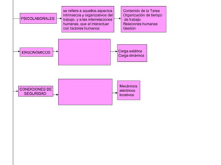 Este documento resume los principales factores de riesgo en el trabajo, incluyendo riesgos físicos como ruido, vibraciones y radiaciones que pueden causar accidentes o enfermedades; químicos como sustancias sólidas, líquidas o gaseosas; biológicos como bacterias, hongos o animales; psicolaborales relacionados con la tarea, tiempo de trabajo y relaciones humanas; ergonómicos como carga estática y dinámica; y condiciones de seguridad mecánicas, eléctric