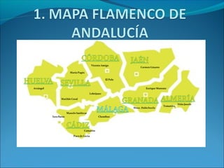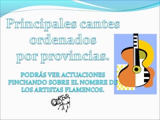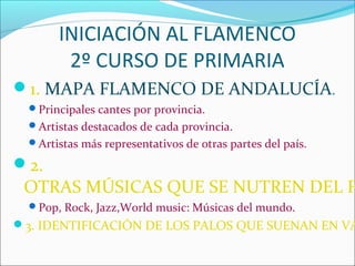 Este documento presenta un curso de iniciación al flamenco para alumnos de 2o curso de primaria. Explica los cantes típicos y artistas destacados de cada provincia andaluza, además de cómo el flamenco ha influenciado a otros géneros musicales como el pop, rock y jazz. Finalmente, propone identificar diferentes palos flamencos a través de ejemplos musicales.