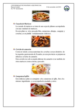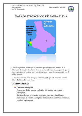 El documento presenta un mapa gastronómico de la provincia de Santa Elena en Ecuador, destacando platos típicos de sus tres cantones como camarones al ajillo, cazuela de mariscos y ceviche de camarón en Salinas, y sancocho de pescado en La Libertad. La provincia se caracteriza por usar productos marinos locales en su cocina, especialmente mariscos.