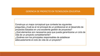 El documento describe los conceptos clave de la gerencia de proyectos y el ciclo de vida de un proyecto. El rol principal de un profesional es liderar el desarrollo del proyecto comunicando y motivando al equipo a través de las distintas fases. Un ciclo de vida de proyecto completo requiere una acta de constitución, avances y el producto final. Los principales responsables de establecer el ciclo de vida son el director del proyecto, el cliente y el equipo del proyecto.