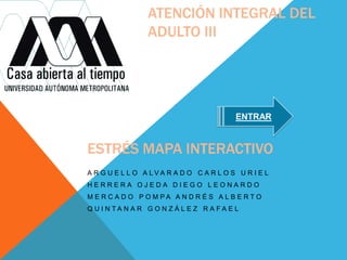 ATENCIÓN INTEGRAL DEL ADULTO III ENTRAR ESTRÉS MAPA INTERACTIVO A R G U E L L O A LVA R A D O C A R L O S U R I E L HERRERA OJEDA DIEGO LEONARDO M E R C A D O P O M PA A N D R É S A L B E RTO Q U I N TA N A R G O N Z Á L E Z R A FA E L