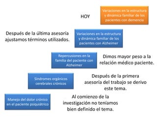 Este documento describe las variables involucradas en las variaciones en la estructura y dinámica familiar de pacientes con demencia. La variable causal es la demencia, mientras que la variable independiente son las variaciones en la estructura y dinámica familiar. Las variables controlables son la edad del paciente, tiempo de evolución, gravedad de la patología y estrato socioeconómico. La variable no controlable es la concepción cultural de la demencia.