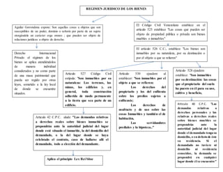 El documento explica el régimen jurídico de los bienes según el Código Civil Venezolano. Define los bienes como cosas susceptibles de dominio y establece que pueden ser muebles o inmuebles. Los bienes inmuebles incluyen terrenos, edificios y construcciones permanentes, así como cosas puestas en el suelo para su uso y derechos sobre predios. El régimen de los bienes se rige por la ley del lugar donde están ubicados.