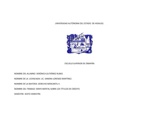 Este documento presenta un mapa mental sobre los títulos de crédito como trabajo para la materia de Derecho Mercantil II. El mapa mental fue realizado por Verónica Gutiérrez Rubio para la Licenciada Sandra Lorenzo Martínez en el sexto semestre de la Escuela Superior de Zimapán de la Universidad Autónoma del Estado de Hidalgo y cubre temas como prenda, letra de cambio, cheque, pagaré y bibliografía.