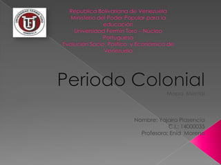 El documento describe el periodo colonial de Venezuela desde 1548 hasta 1823. Los españoles llegaron en 1548 y dominaron a los indígenas, fundando ciudades y estableciendo la religión católica, el idioma español e instituciones. Hubo dos tipos de conquista: armada y pacífica. La primera involucró enfrentamientos violentos y la segunda enseñanza de la lengua y religión. Las primeras ciudades fundadas fueron Nueva Cádiz en 1510 y Nueva Córdoba (luego Cumaná) en 15