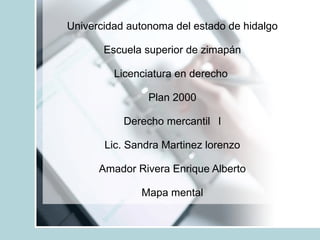 Este documento presenta el plan de estudios de la licenciatura en derecho de la Universidad Autónoma del Estado de Hidalgo en la Escuela Superior de Zimapán. El documento se enfoca en el curso de Derecho Mercantil I impartido por la Lic. Sandra Martínez Lorenzo y el Sr. Amador Rivera Enrique Alberto.