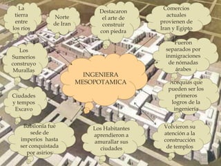Los primeros logros de ingeniería se remontan a las civilizaciones de Mesopotamia entre los ríos Tigris y Éufrates, donde los sumerios construyeron murallas, ciudades y templos, y los babilonios posteriormente amurallaron sus ciudades y construyeron templos hasta ser conquistados por los asirios.