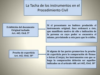 El documento presenta información sobre el procedimiento de tacha de instrumentos en Venezuela. Explica las etapas del proceso de tacha, incluyendo la oportunidad para realizar la tacha, las causales de tacha, las facultades del juez, la suspensión si hay un juicio penal en curso, y los plazos para apelar. También describe los trámites posteriores a la presentación de informes como la posibilidad de ordenar nuevas diligencias dentro de los 15 días.
