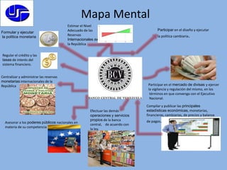 El documento presenta las funciones principales del banco central de un país, que incluyen formular y ejecutar la política monetaria, regular el crédito y las tasas de interés, administrar las reservas internacionales, participar en el diseño e implementación de la política cambiaria, y compilar estadísticas económicas.