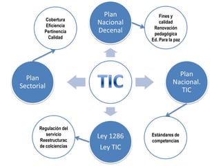 El documento presenta un plan nacional decenal para mejorar la cobertura, eficiencia, pertinencia y calidad de las tecnologías de la información y comunicación (TIC) en el sector educativo a través de la implementación de un plan nacional de TIC, la reestructuración de Colciencias, la regulación del servicio, el establecimiento de estándares de competencias y la promoción de fines educativos como la renovación pedagógica y la educación para la paz, todo en el marco de las leyes 1286 y de TIC.