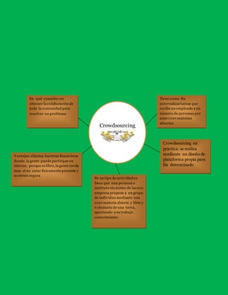 El crowdsourcing consiste en obtener la colaboración de la comunidad para resolver un problema mediante convocatorias abiertas. Se utiliza para externalizar tareas a un grupo de personas a través de una plataforma diseñada para un fin determinado. El crowdsourcing ofrece ventajas como eliminar barreras financieras y permitir que la gente participe y revele más al no estar físicamente presentes.