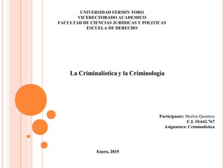 La criminalística y la criminología son disciplinas relacionadas pero distintas. La criminalística es más práctica y se aplica una vez cometido el delito para recolectar evidencia física mediante técnicas científicas. La criminología es más teórica, centrada en prevenir delitos mediante el estudio de las conductas desviadas y factores sociales que influyen en el crimen.