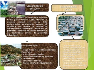 Este documento resume dos tipos de contaminación: contaminación del suelo y contaminación sónica. La contaminación del suelo ocurre cuando hay compuestos químicos hechos por el hombre o alteraciones en el ambiente natural del suelo, causados por derrames de tanques de almacenamiento, pesticidas, rellenos sanitarios o desechos industriales. La contaminación sónica se refiere al exceso de sonido que altera el ambiente normal y es causada por ruido de vehículos, máquinas, equipos, música alta volumen y explosiones