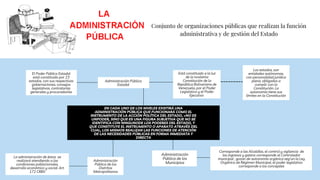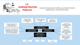 Este documento describe la administración pública en Venezuela según la Constitución Bolivariana de 1999. Explica que la administración pública nacional está compuesta por el poder ejecutivo y legislativo a nivel nacional, estatal y municipal. A cada nivel le corresponde una administración pública que funciona como instrumento del estado para atender las necesidades públicas de manera directa.