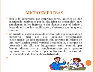 Las microempresas han surgido debido al desempleo y la necesidad de generar ingresos complementarios. Las pymes son agentes emprendedores con sus propias lógicas y culturas. Las medianas empresas tienen límites ocupacionales y financieros definidos por los estados. Las pymes cumplen un papel importante en todas las economías al proveer productos individualizados, servir como proveedores a grandes empresas y ser apropiadas para ciertas industrias como la agrícola.